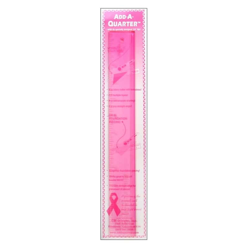 Add A Quarter Plus 12″ Ruler simplifies foundation piecing. One edge is tapered for folding back foundation paper and the other side has a 1/4″ lip so you can quickly trim the seam allowance with your rotary cutter. 2″ x 12″ Pink ruler.