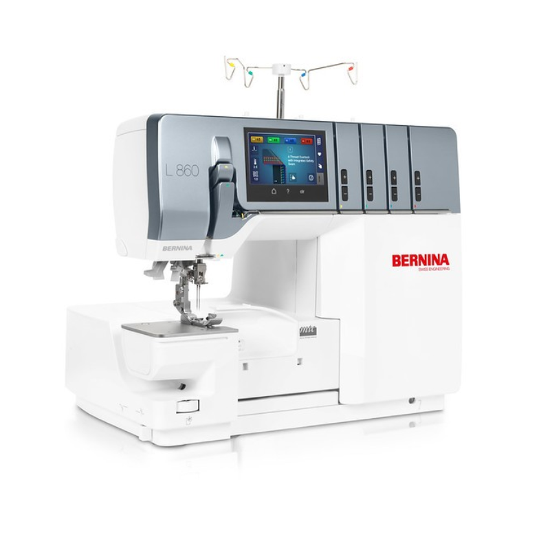 The BERNINA L 860 is perfectly suited for working with all types of threads and fabrics, particularly highly elastic and knitted materials. The machine offers a variety of stitches, all selectable via the color touch screen. The exclusive One-step BERNINA Air Threader makes threading the loopers unbelievably easy.