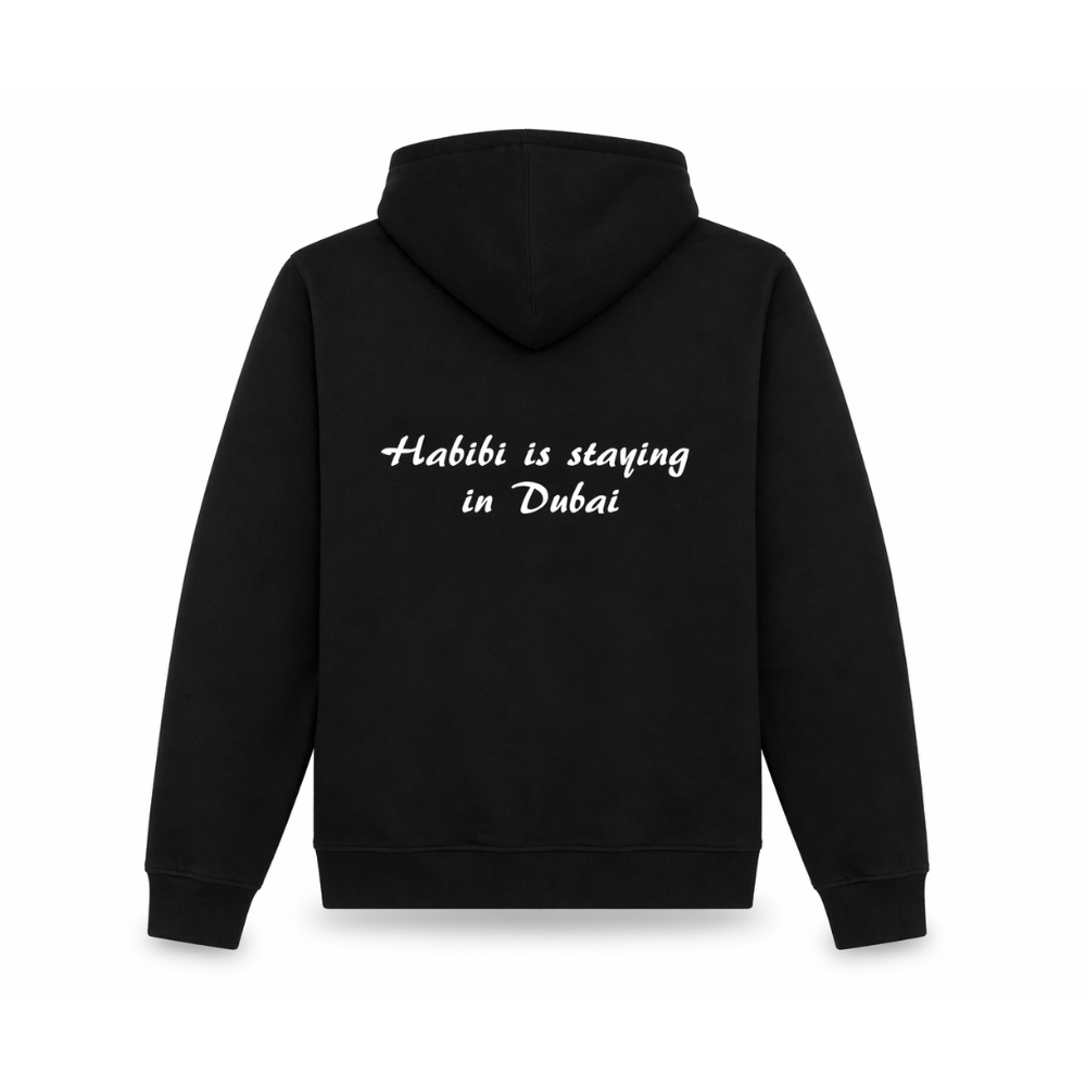 This premium black hoodie is built for those who stand firm with the UAE. Featuring a subtle #Emirati chest print on the front and the bold message “Habibi is staying in Dubai” across the back, it represents resilience, unity, and pride when it matters most.