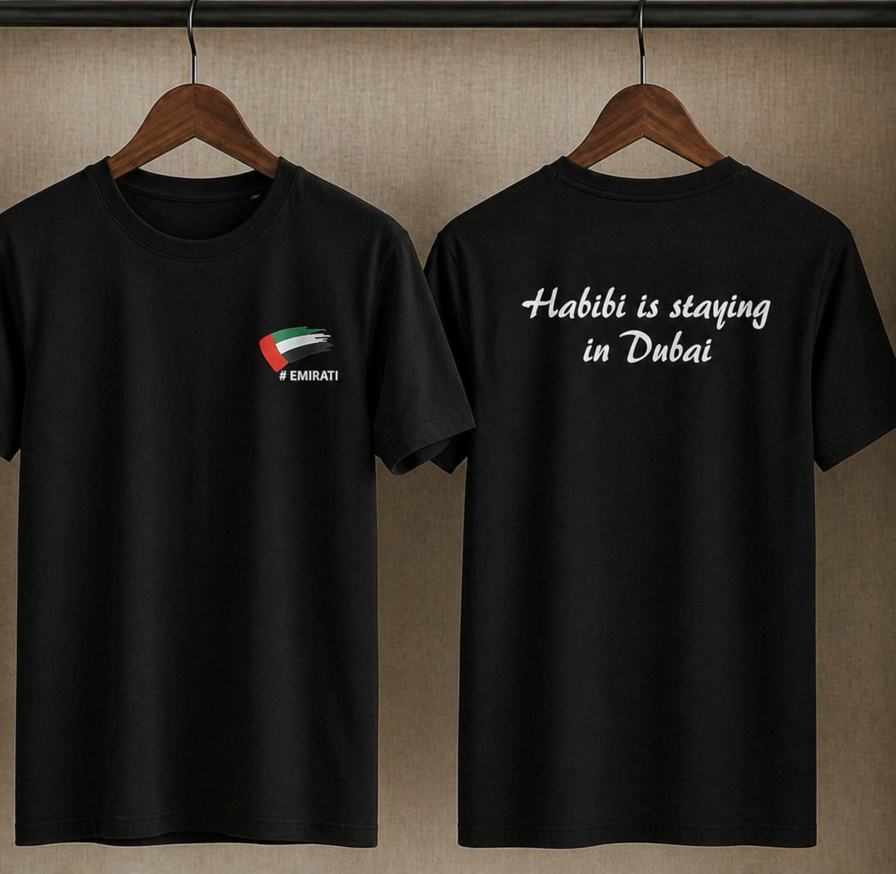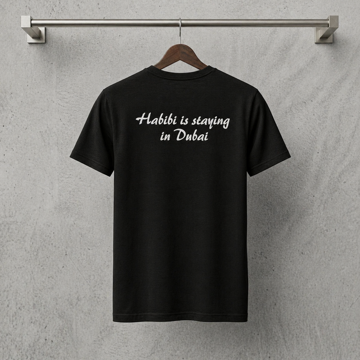 Featuring a subtle #Emirati-inspired chest detail on the front and the bold statement “Habibi Is Staying in Dubai” across the back, this piece represents unity, belonging, and resilience.
